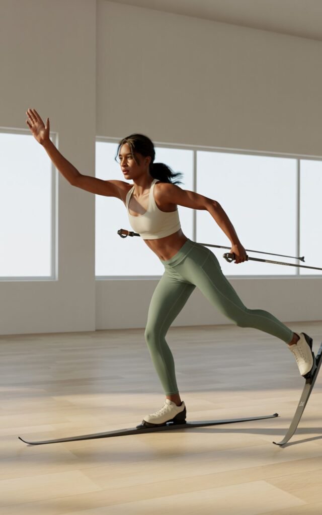 Next is a fun, low-impact cardio move called cross-country skiing. Step side to side while swinging your arms big, just like you’re skiing.