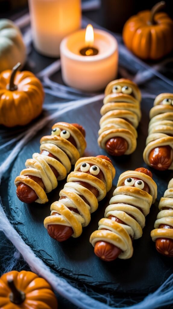 When they’re done, use small dots of mustard or ketchup to create tiny eyes. In minutes, you’ve got adorable little mummies ready to haunt your snack table.