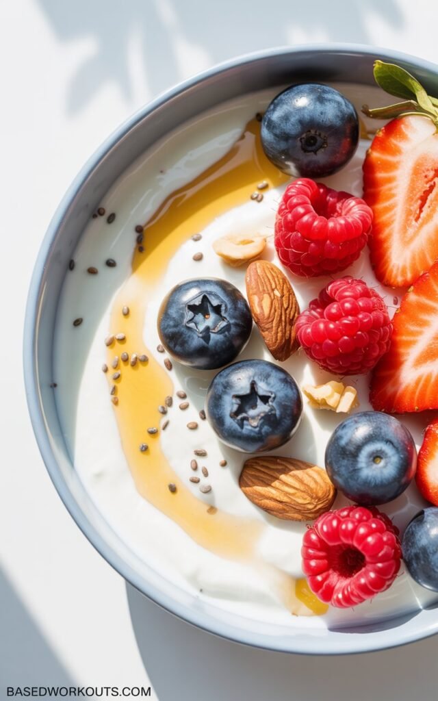 Greek yogurt with berries and nuts is a delicious, no-fuss snack that combines protein, healthy fats, and antioxidants.