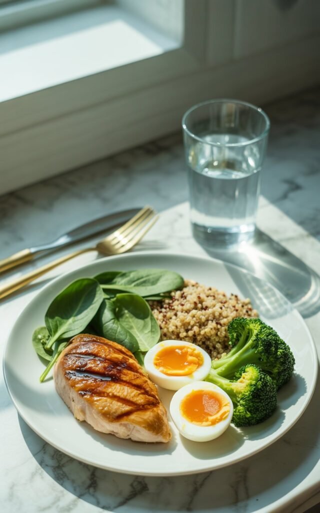 • High-quality protein sources: chicken, fish, eggs, Greek yogurt, whey protein