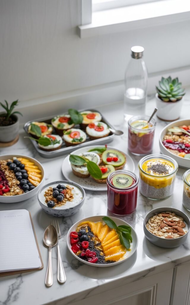 - Prep ahead: Make egg muffins, chia pudding, or smoothie packs in advance.