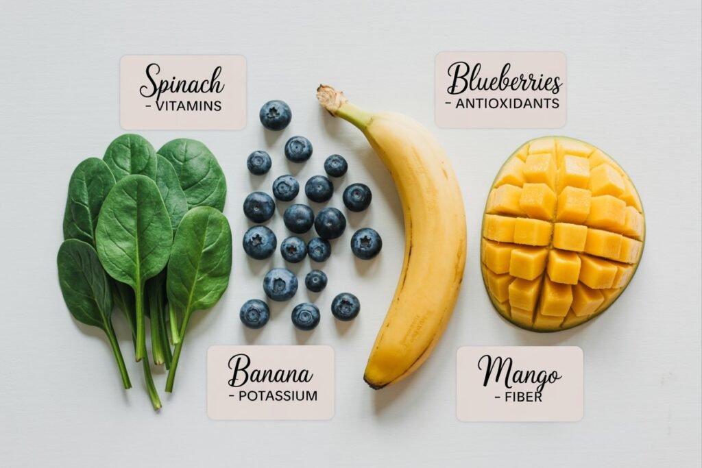 Bananas add creaminess and potassium, while mango, pineapple, or apple give tropical sweetness without refined sugar.
