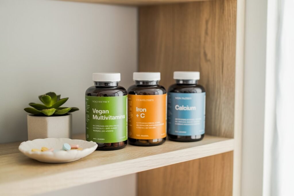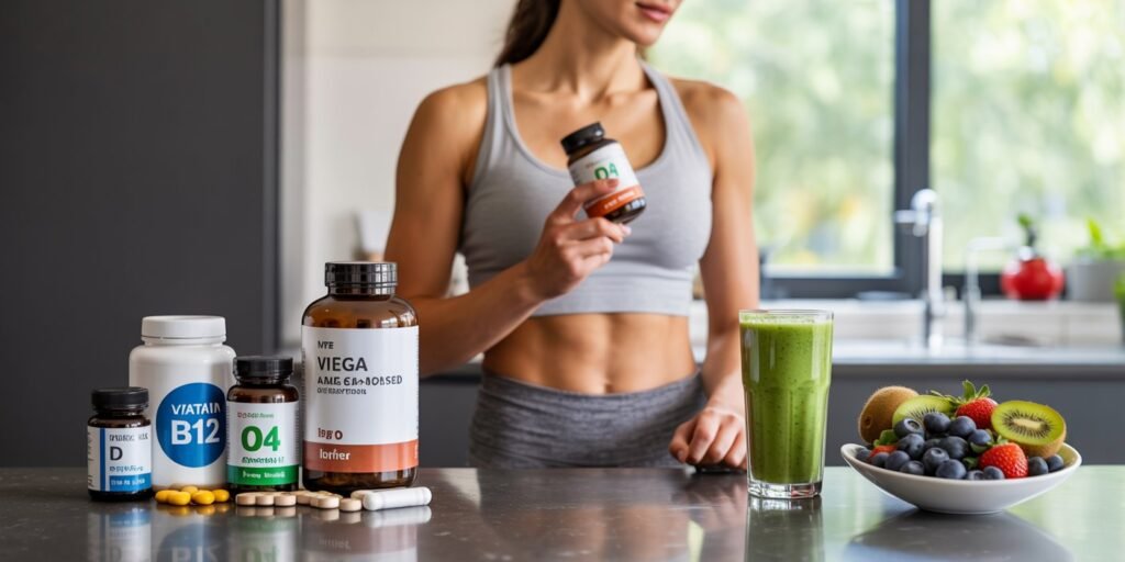 Common supplements include vitamin B12, vitamin D, omega-3 (from algae oil), iron, and sometimes calcium or zinc.