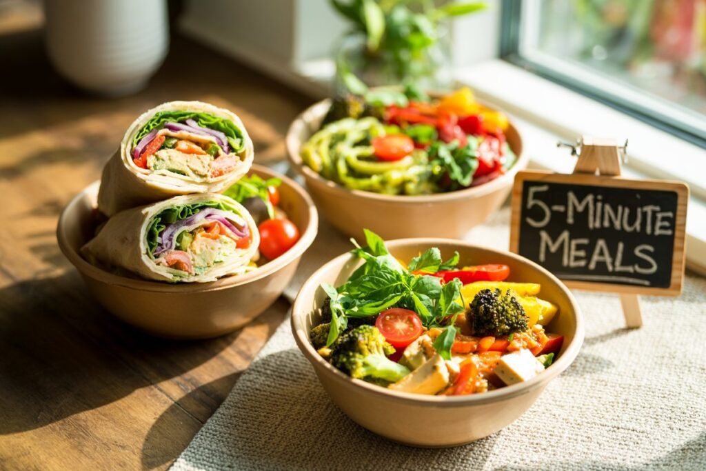 Start with one-pan stir-fries. Toss some tofu, frozen veggies, and soy sauce into a skillet, and you’ve got dinner in under 10 minutes.
